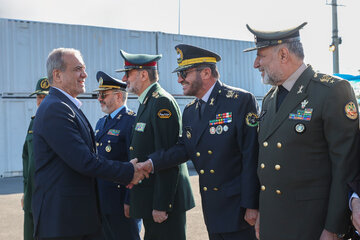 در ادامه تصاویری از مسعود پزشکیان، سردار محمد باقری رئیس ستاد کل نیروهای مسلح، امیر سید عبدالرحیم موسوی فرمانده کل ارتش، سردار حسین سلامی فرمانده کل سپاه پاسداران، امیر نصیرزاده وزیر دفاع و پشتیبانی نیروهای مسلح، امیر کیومرث حیدری فرمانده نیروی زمینی ارتش، سردار رادان فرمانده انتظامی کشور، سردار محمد پاکپور فرمانده نیروی زمینی سپاه پاسداران، سردار امیرعلی حاجی زاده فرمانده هوا فضا سپاه پاسداران، سردار سلیمانی رئیس سازمان بسیج مستضعفین مشاهده می کنید.