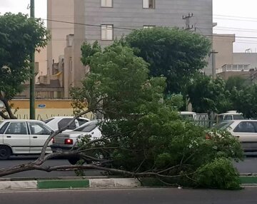 خسارت تندباد ۸۰ کیلومتری به خودروها و فضای سبز در این شهر/عکس