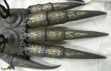 در نگاه نخست، این دستکش‌های جنگی بیشتر شبیه یک زیورآلات تشریفاتی‌اند تا سلاحی برای میدان نبرد. نقش‌ونگارهای گل‌دار روی سطح آنها بازتابی از عشق ایرانیان به زیبایی و ظرافت است، حتی در ابزارهای جنگی. اما با دقت بیشتر، ماهیت واقعی آنها آشکار می‌شود: پنجه‌هایی بلند و تیغ‌مانند که از انگشتان بیرون زده‌اند و برآمدگی‌های نوک‌تیز روی بند انگشتان که برای شکافتن زره یا بدن دشمن طراحی شده‌اند.