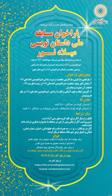 به گزارش سردبیر پرس، این مسابقه ملی با هدف گسترش ادبیات داستانی پیرامون شخصیت و فضائل امیرالمومنین(ع) و آموزه‌های علوی در ایام الله میلاد نور و ولادت مولی متقیان امیرالمومنین (ع) در دو بخش الف) داستان کوتاه و ب) داستان کوتاه کوتاه (داستانک) و در محور های الف) بازنمایی، بازگویی، بازآفرینی شخصیت و سیره زندگی امیرالمومنین امام علی(ع) ب) نمایش تاثیر وجوه شخصیت امیرالمومنین امام علی(ع) در زیست اهل بیت(ع)، اصحاب آن حضرت و معاصران ج) آفرینش ابعاد و نحوه آشنایی و الفت با زندگی  امیرالمومنین امام علی(ع) در نظر اندیشمندان برگزار می شود.
