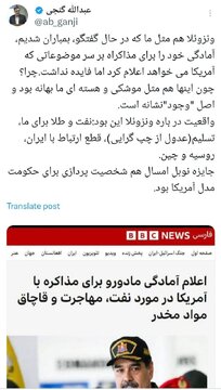به گزارش سردبیر پرس، عبدالله گنجی، فعال رسانهای اصولگرا در واکنش به حمله آمریکا به ونزوئلا و بازداشت مادورو نوشت: «ونزوئلا هم مثل ما که در حال گفتگو ، بمباران شدیم، آمادگی خود را برای مذاکره بر سر موضوعاتی که آمریکا میخواهد اعلام کرد اما فایده نداشت. چرا؟ چون اینها هم مثل موشکی و هستهای ما بهانه بود و اصل «وجود» نشانه است».