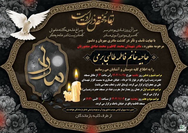 مراسم تشییع والده شهیدان محمدکاظم و محمدصادق منصوریان امروز یکشنبه ۲۸ دی، ساعت ۱۴ از مقابل مسجد حضرت زینب (س) قم در خیابان حائری بلوار ۱۵ خرداد برگزار و در گلزار شهدای علی بن جعفر(ع) به خاک سپرده خواهد شد.