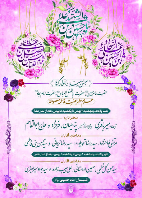 یکشنبه پنجم بهمن مصادف با میلاد امام سجاد(ع) بعد از نماز عصر مراسم جشن با مداحی سید جواد میرجعفری و بعد از نماز عشاء با سخنرانی حجت الاسلام و المسلمین حاج ابوالقاسم و مداحی سید محسن بنی فاطمه در شبستان امام خمینی(ره) برگزار خواهد شد.