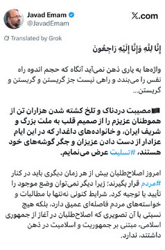 به گزارش سردبیر پرس، جواد امام ، سخنگوی جبهه اصلاحات در واکنشی توییتری به اتفاقات دی ماه نوشت: « مصیبت دردناک و تلخ کشته شدن هزاران تن از هموطنان عزیزم را از صمیم قلب به ملت بزرگ و شریف ایران، و خانوادههای داغدار که در این ایام عزادار از دست دادن عزیزان و جگر گوشههای خود هستند، تسلیت عرض مینمایم.»